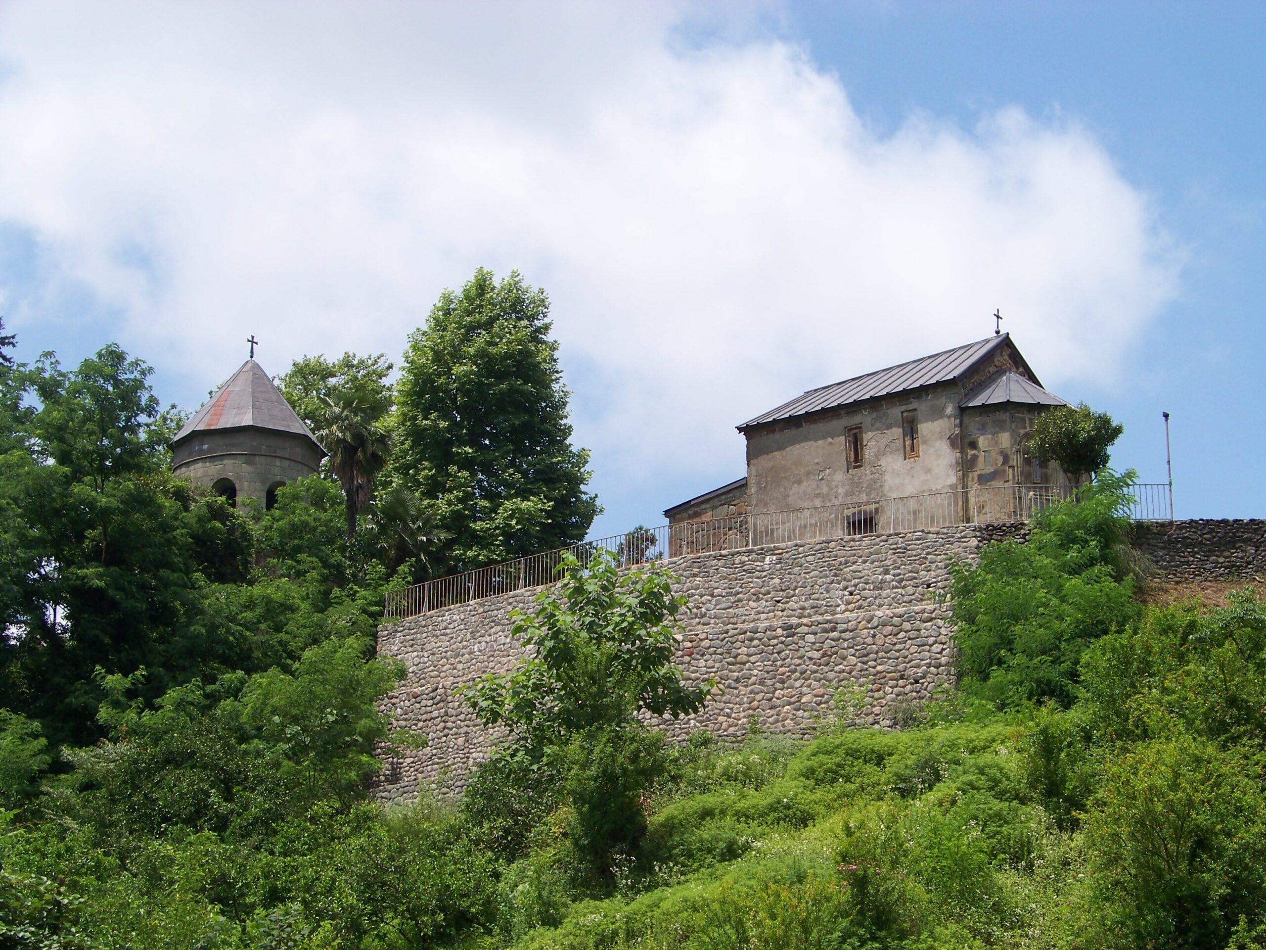 Окрестности. Если вы выбрались в Озургети на автомобиле, не пропустите и архитектурные достопримечательности в окрестностях. Прежде всего — монастырь Шемокмеди, то есть Творца. Он находится всего в пяти километрах к востоку, на холме над рекой Бжужи. Это один из ключевых памятников Гурии: бывшая резиденция шемокмедского епископа и усыпальница князей Гуриели. Главный храм — Спасский собор — сложен из массивных блоков разноцветного порфира и выглядит архаично даже по грузинским меркам. Внутри сохранились яркие и нестандартные фрески XVII века и редкая деталь — каменный трон епископа. В XIX веке Шемокмеди стал одним из центров антироссийского восстания. Следы крепостных сооружений почти исчезли, но сам монастырь уцелел и до сих пор производит сильное впечатление. Сюда стоит забраться и ради архитектуры, и ради окружающих пейзажей речной долины.