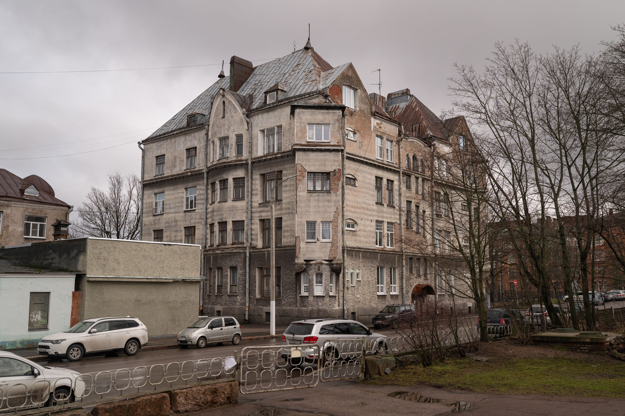 • На Железнодорожной улице, 4 обратите внимание на дом фирмы «Сыновья Ф. Сергеева и Ко», его построил архитектор Пааво Уотила в 1908 году. Если повезет попасть внутрь, увидите едва ли не самую красивую парадную Выборга. А на фасаде можно найти надпись на финском языке, напоминающую о первом владельце — знаменитом русском купце и промышленнике в Финляндии.