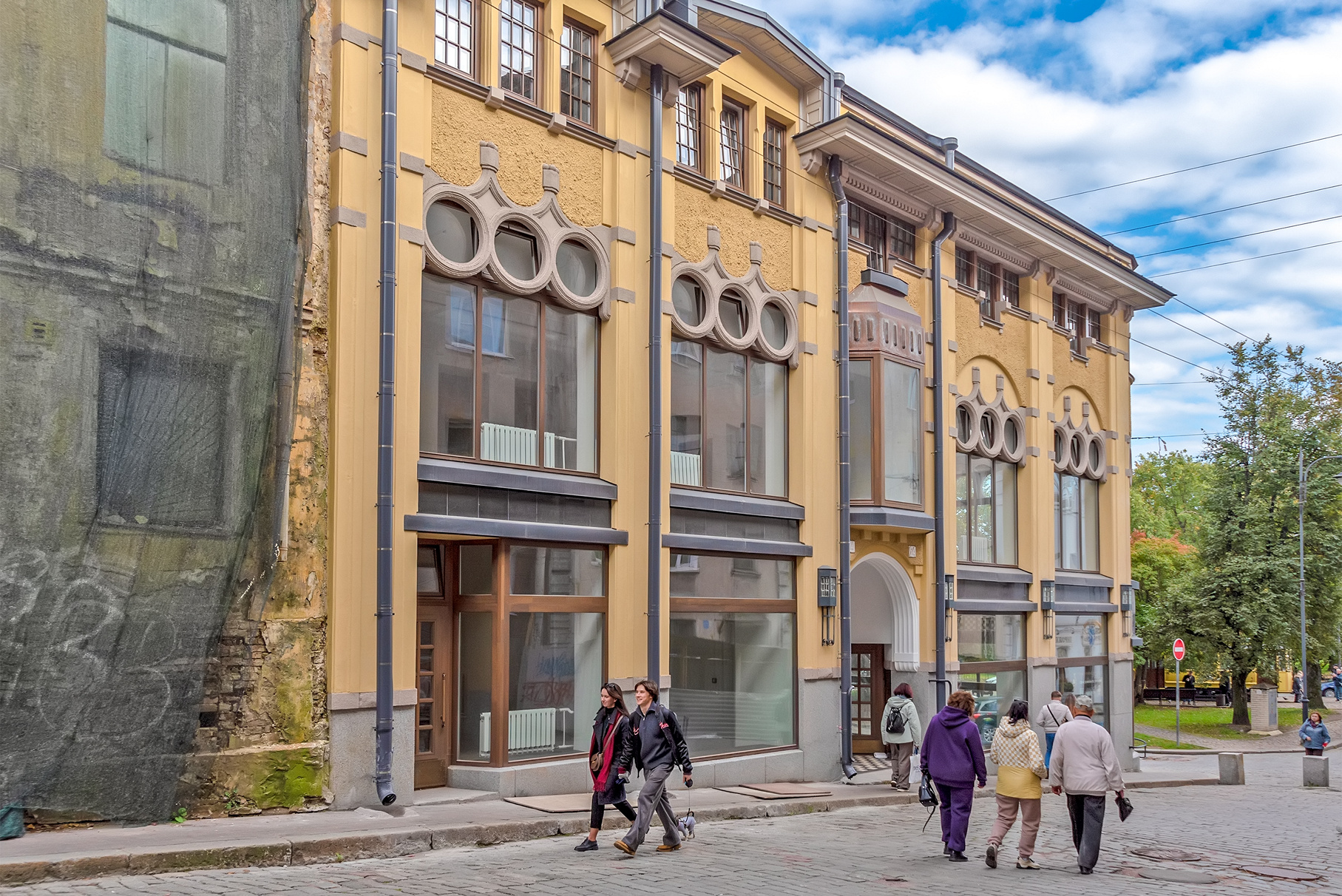 Прогуливаясь по Красной площади Выборга, обратите внимание на дом на Северной улице, 12, он же бывший дом общества Arina. Здание в стиле модерн, построенное в 1904 году по проекту Алана Шульмана, стало ярким положительным примером реставрации. Фасад привели в порядок за счет областного фонда капитального ремонта, а уже сами жители вместе с волонтерами расчистили в подъезде роспись с цветочным узором. Кроме того, в сотрудничестве с фондом «Внимание» они воссоздали парадную дверь в здание по историческим фото и чертежам.