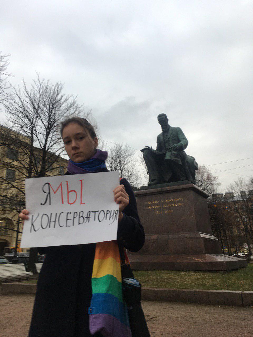 В дни петербургского культурного форума студенты и выпускники консерватории имени Римского-Корсакова вышли на Театральную площадь с плакатами «Спасите консерваторию» и «Я/Мы консерватория». Так они попытались привлечь внимание к реставрации, которая тянется уже пять лет. Всё это время студенты занимаются в соседнем здании, которое также ремонтируют. Они жалуются, что там не хватает места, а полы помещений покрывались плесенью.