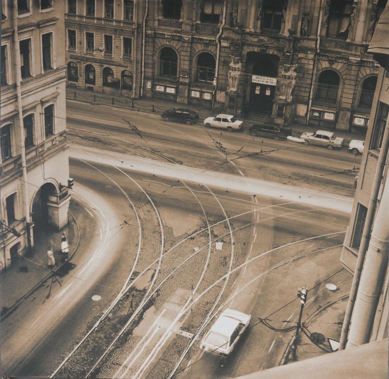 «Одной из причин реконструкции благоустройства улицы Белинского на всем ее протяжении явилась необходимость смены рельс и путей сложной пересечки на углу проспекта Володарского [Литейного] и этой улицы. Интересно отметить, что на улице Белинского уложены трамвайные рельсы шведского производства, захваченные в числе прочих трофеев у белофиннов [то есть во время с Финляндией 1939-1940 годов], — писал журнал «Архитектура Ленинграда» в первом номере за 1941 год — Увеличение радиуса закругления рельсовых путей на углу улиц Белинского и Некрасова настолько сузило проезжую часть, что возникла необходимость провести сквозную пробивку углов трех домов. Это позволило не только обеспечить одновременный поворот трамвая и автомашины, но и создало безопасный пешеходный путь при огибании угла. Проходы были архитектурно оформлены». (Третий угловой дом, о котором идет речь в заметке, судя по всему, стоит на Литейном, 38. Рельсы со стороны улицы Некрасова сняли в 2001-м, но проход сохранился).