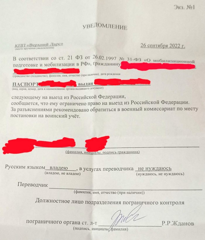 Там была очередь, ребята ссорились с погранцами. Погранцы сказали им, что выдают уведомление: в нем есть ссылка на ст. 31 ФЗ 1997 года, на пункт о мобилизации — о том, что запрещен выезд с места жительства. И якобы на основании этого они ограничивают выезд. Это уведомление нам выдали под подпись в двух экземплярах, один из которых остается у погранцов, один выдается мне. В нем были данные моего загранпаспорта. После этого погранец вывел нас обратно. Загран мне отдали с уведомлением, когда вывели из КПП.