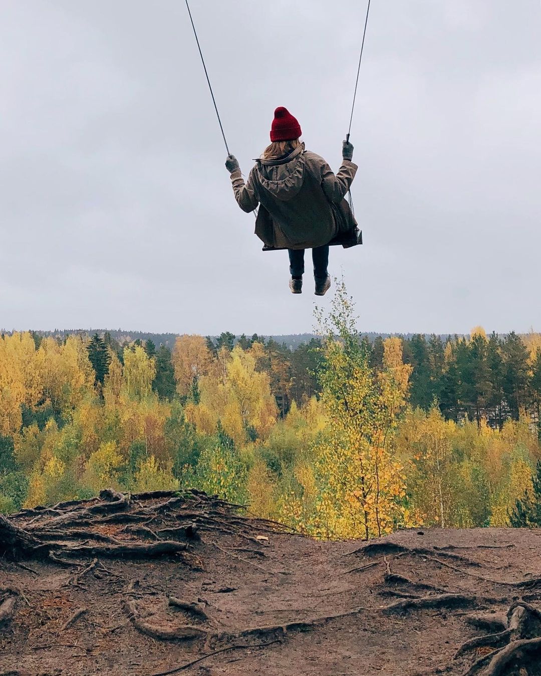 Чтобы добраться напрямую до качелей над обрывом на том же автобусе № 552А, выходите на остановке «Река Юля-Йоки». От нее нужно пойти в сторону лагеря «Огонек», а от ворот лагеря к качелям через лес ведет тропинка.