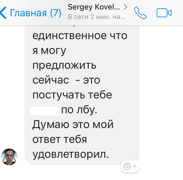 Позднее Дарья опубликовала скриншот переписки с Сергеем. По ее словам, когда она отказалась отнестись с пониманием к ситуации Oh, my, Сергей предложил «постучать ей **** (членом — прим. «Бумаги») по лбу».