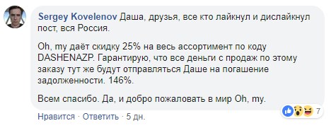 Руководство магазина Oh, my ввело промокод DASHENAZP, который дает скидку 25 % на весь ассортимент бренда. Деньги с продаж Сергей Ковеленов планирует отправить на погашение долга перед Дарьей. Об остальных сотрудниках Ковеленов не упоминал.