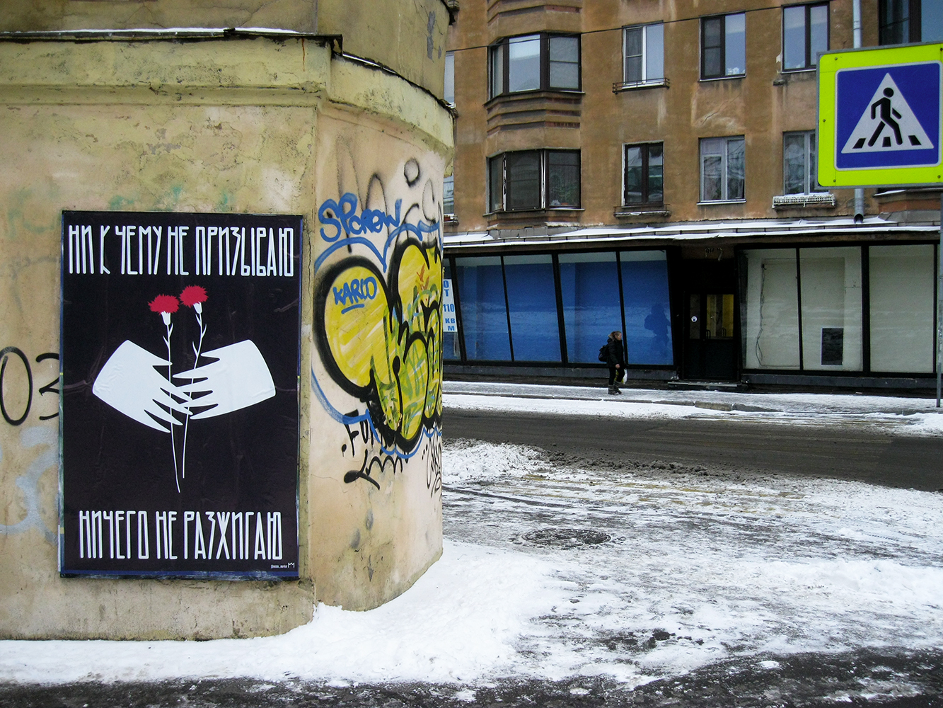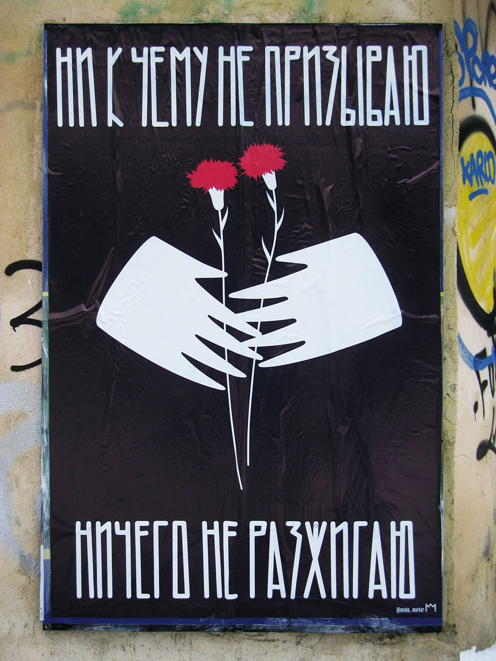 Новая работа Маркера — это плакат, на котором изображены белые руки с двумя гвоздиками и надпись: «Ни к чему не призываю, ничего не разжигаю». Где именно установлена картина, художник решил не говорить, чтобы ее не закрасили.