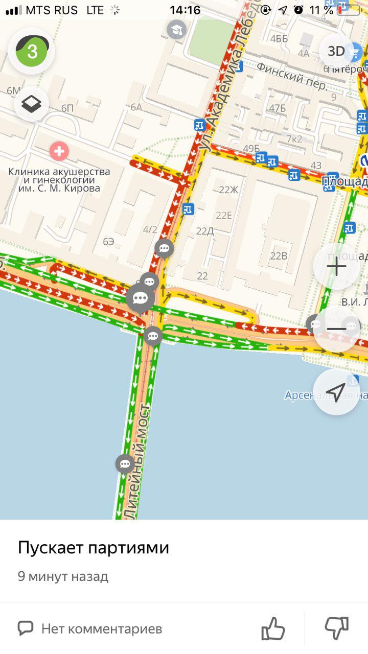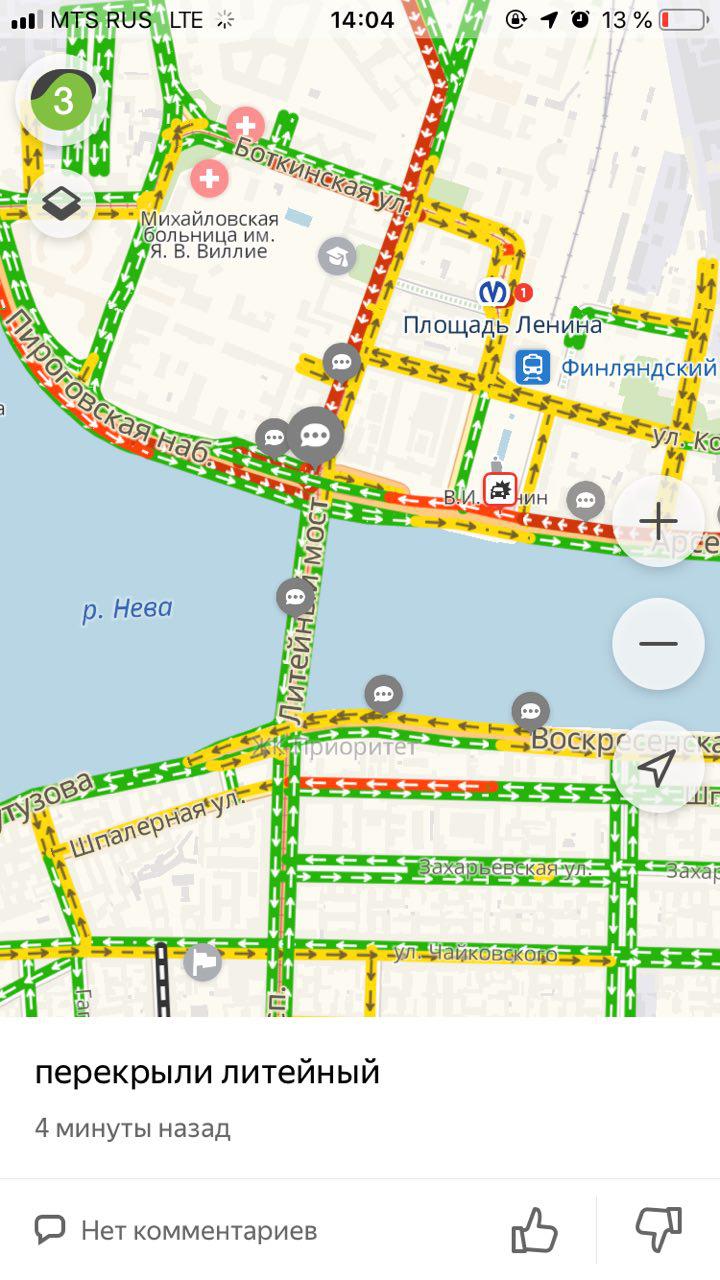 Неподалеку от площади Ленина, где проходит акция памяти Немцова, образовалась пробка. Водители жалуются в «разговорчиках» в приложении «Яндекса», что Литейный мост частично перекрыли. Очевидцы сообщают, что машины пропускают партиями.