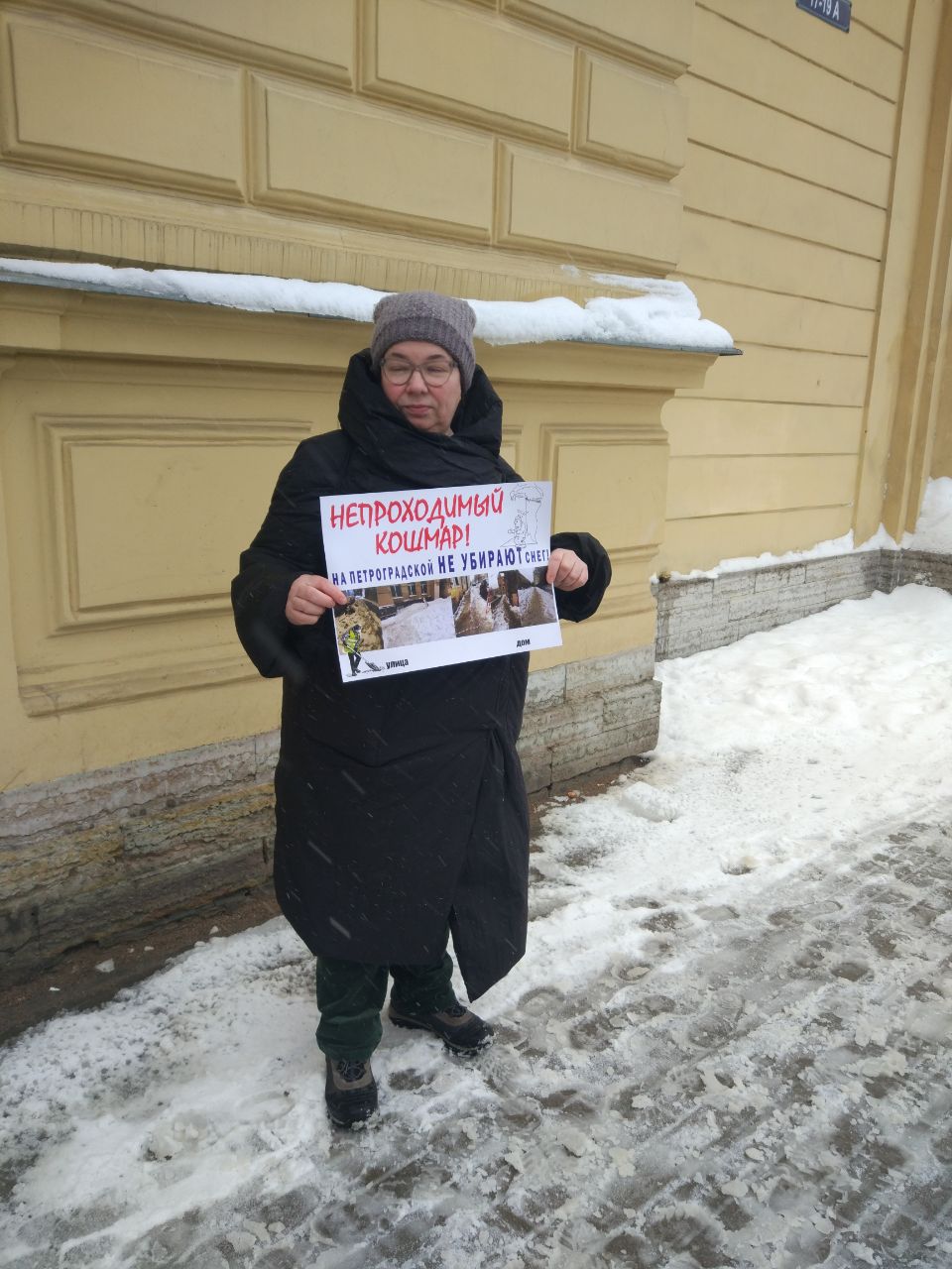 Днем 4 февраля жители Петроградского района вышли на одиночные пикеты из-за плохой уборки снега в городе.