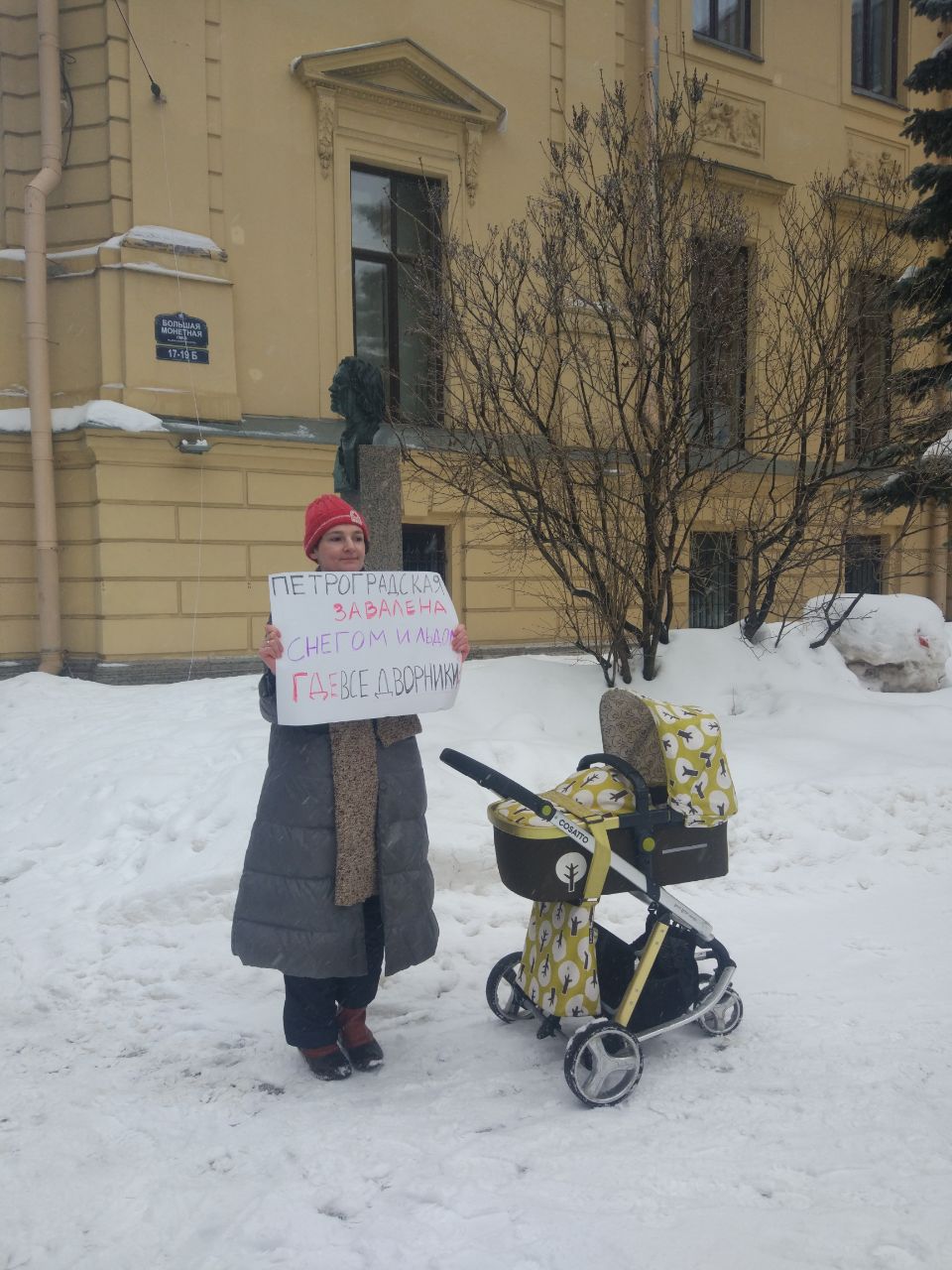 В закрытой группе «Петроградская диаспора» в фейсбуке организаторы пикета призвали всех желающих прийти с плакатами к зданию районной администрации на Большой Монетной, 19. Всего на пикет пришли семь человек. Они держат плакаты с надписью «Непроходимый снег» и «Петроградская завалена снегом и льдом».