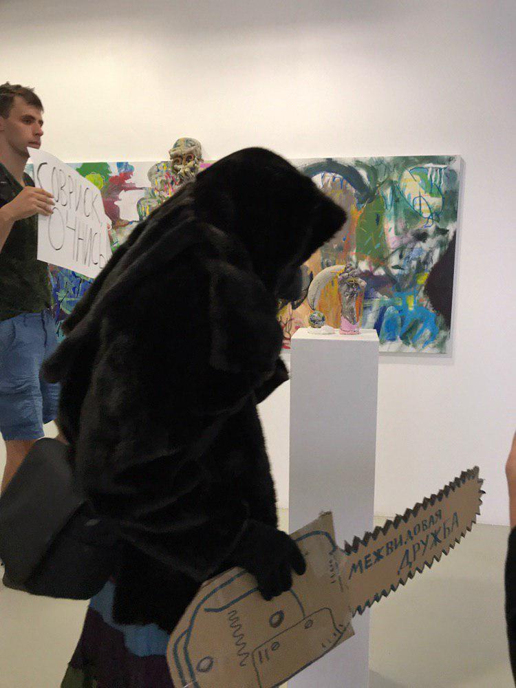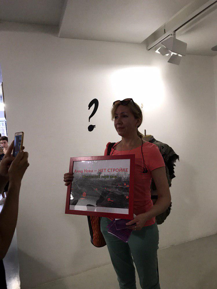 Активисты пришли в галерею с плакатами «Анна Нова без дуболомства, полюбим снова», «Деревья больше никогда не пойдут в Анна Нова, не ходите и вы», а также «Анна Нова — нет стройке».