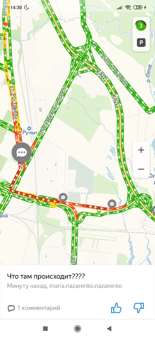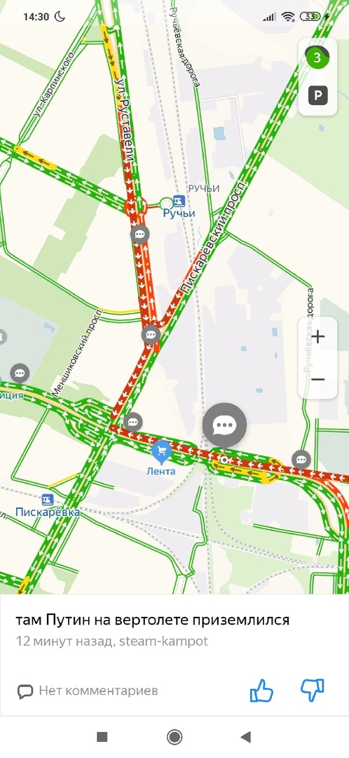 В сервисе «Яндекс.Пробки» водители жалуются на заторы и пишут комментарии с текстом «Славься, наш царь» и «Люди страдают». При этом во всем Петербурге, согласно данным приложения, пробки составляют всего 3 балла.