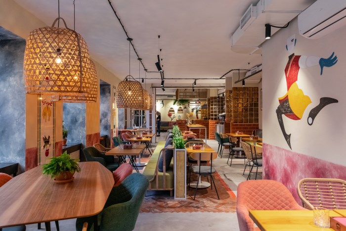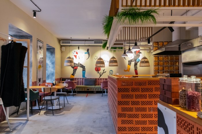 Зал на 58 посадочных мест оформили в светлых тонах, с использованием дерева и других натуральных материалов. Важной частью интерьера стала открытая кухня, а стены украсили иллюстрациями по мотивами картин Нико Пиросмани.