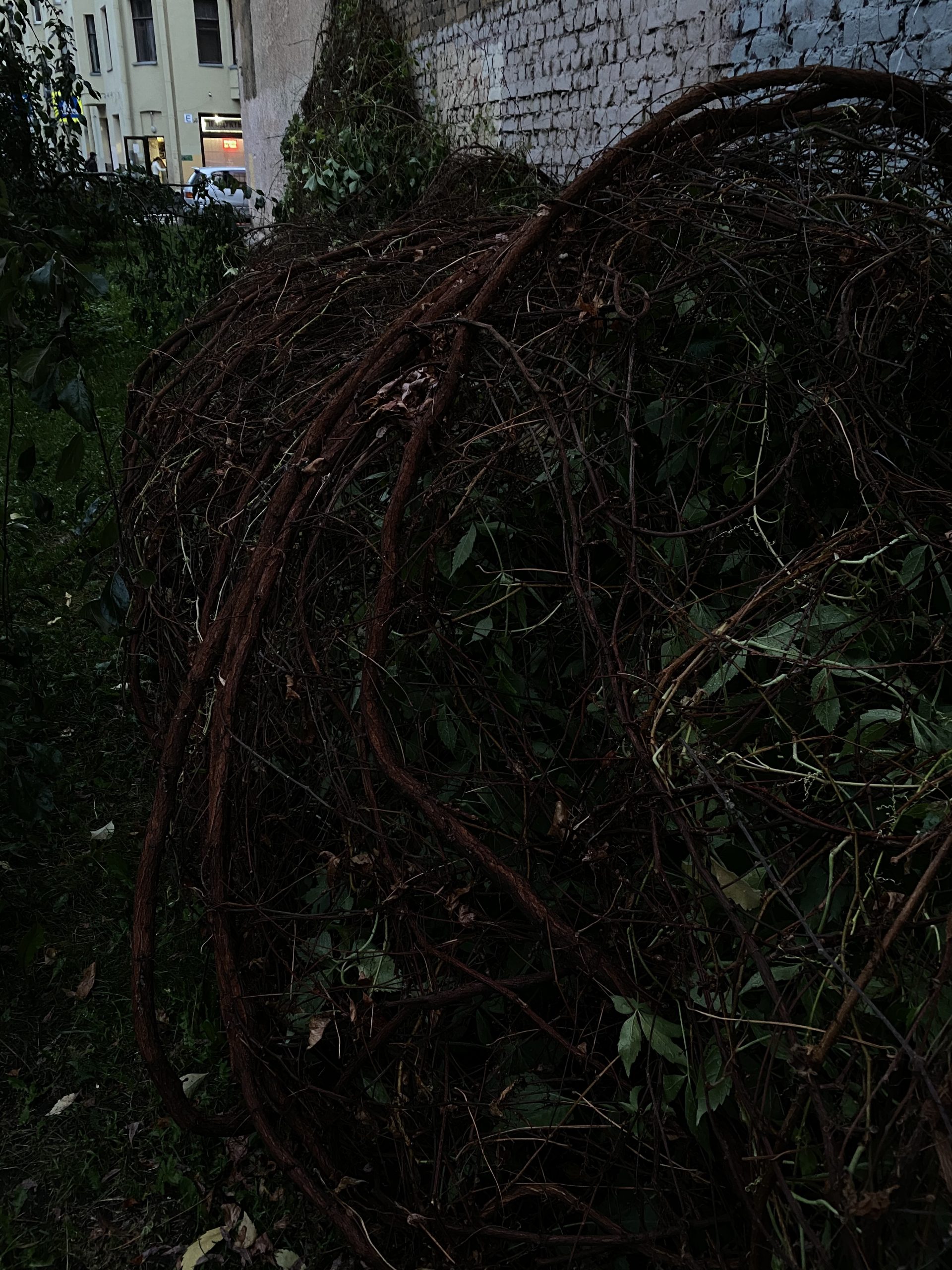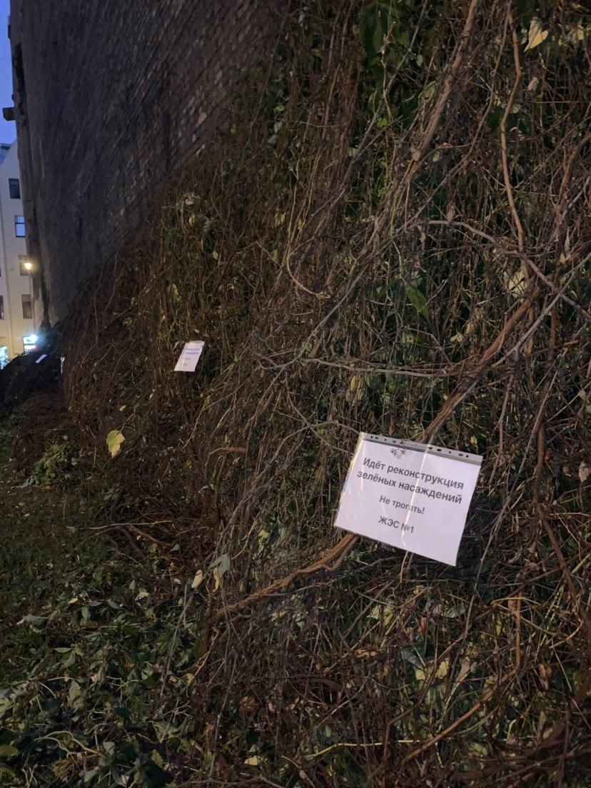 Растение сорвало порывами ветра во время дневной грозы — виноград свернулся кольцами на земле у стены. Активистка фонда «Зеленый Петербург» Варвара Щербакова подтвердила «Бумаге», что следов спила нет. Сейчас инициативная группа из «Зеленого Петербурга» и «Петроградской диаспоры» огораживает растение до утра.