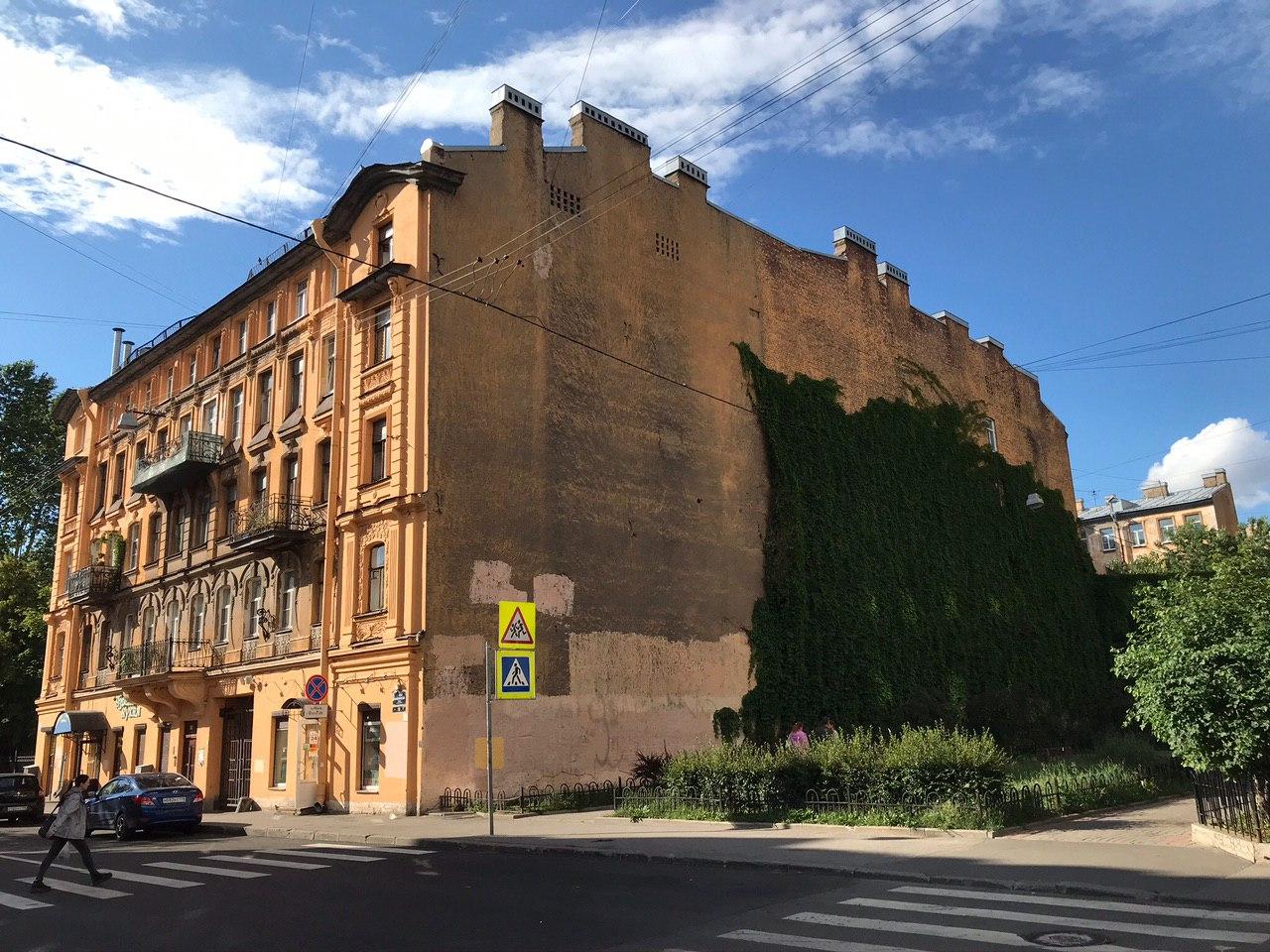 С дома на улице Лизы Чайкиной, 18 сорвало девичий виноград, который покрывал почти половину стены пятиэтажного здания. На это обратили внимание жители Петроградской стороны.