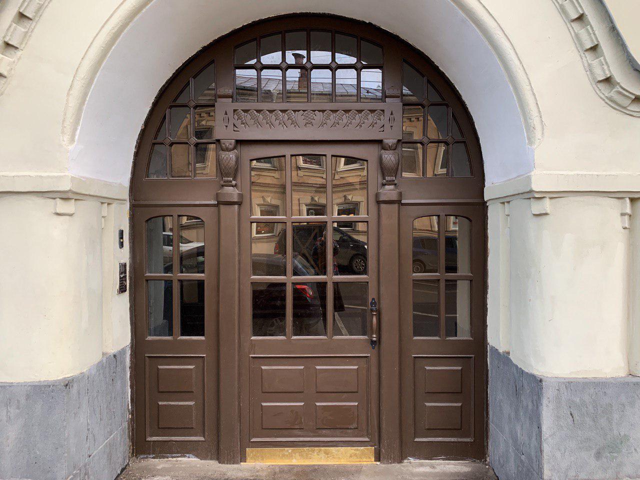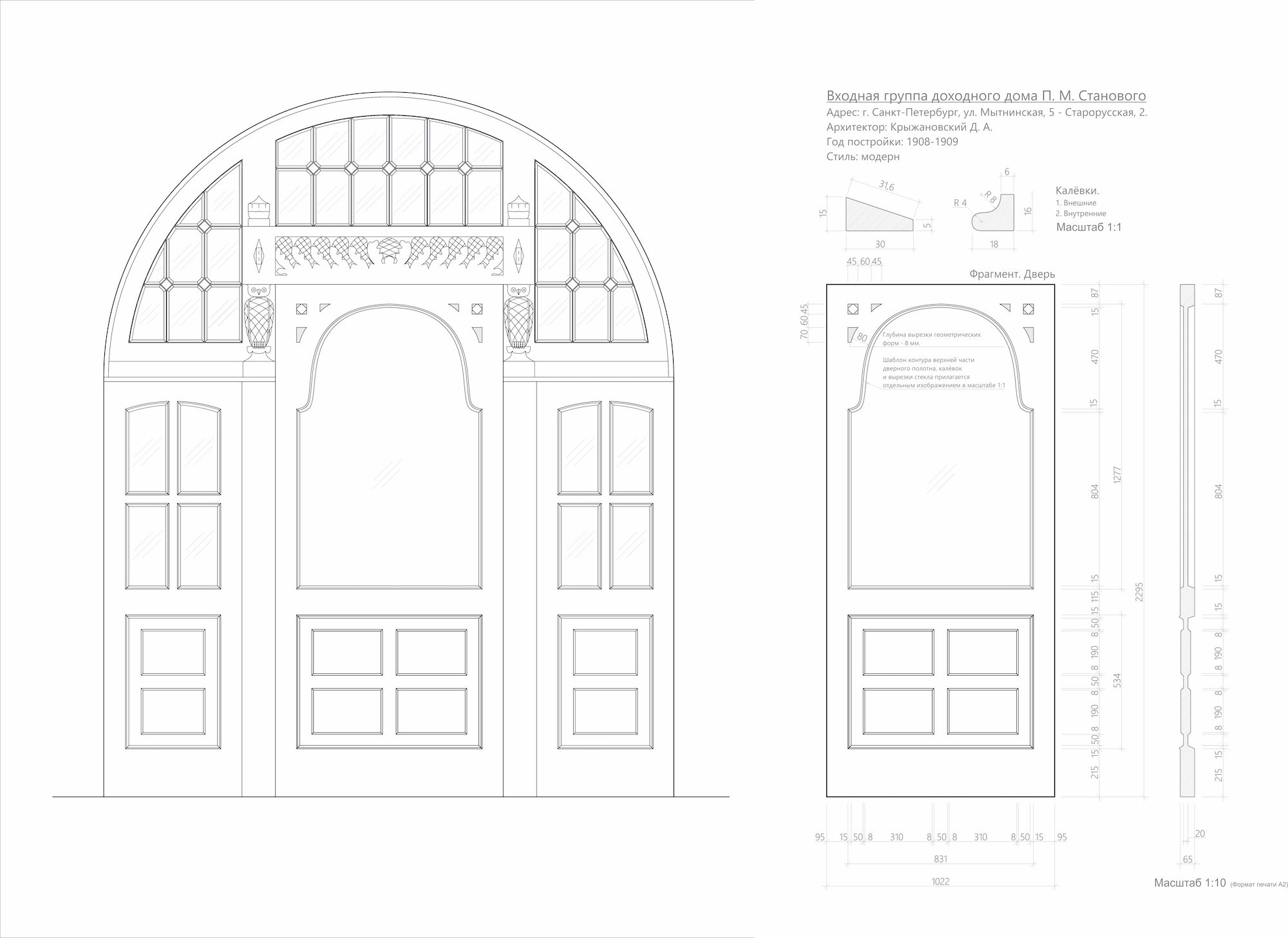 За основу проекта специалисты взяли фотографию 1998 года, на которой хорошо видна дореволюционная дверь. К тому моменту дверь уже утратила нижнюю филенку и стекло. После обсуждений с экспертами и пяти месяцев работы специалисты фонда разработали эскиз.