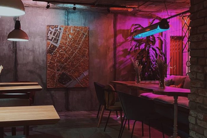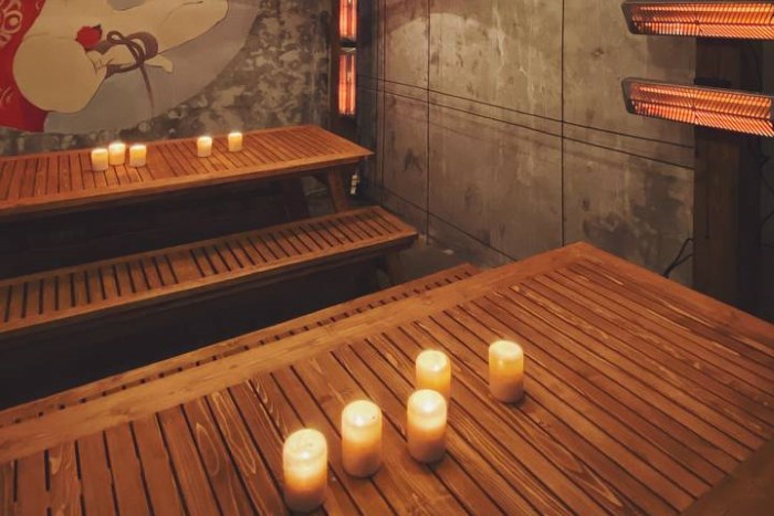 Заведение разделили на несколько зон: двор-колодец с японской сливой и стрит-артом на тему шибари, арку-сад с контактным баром и основной зал, оформленный в стиле японской опиумной.