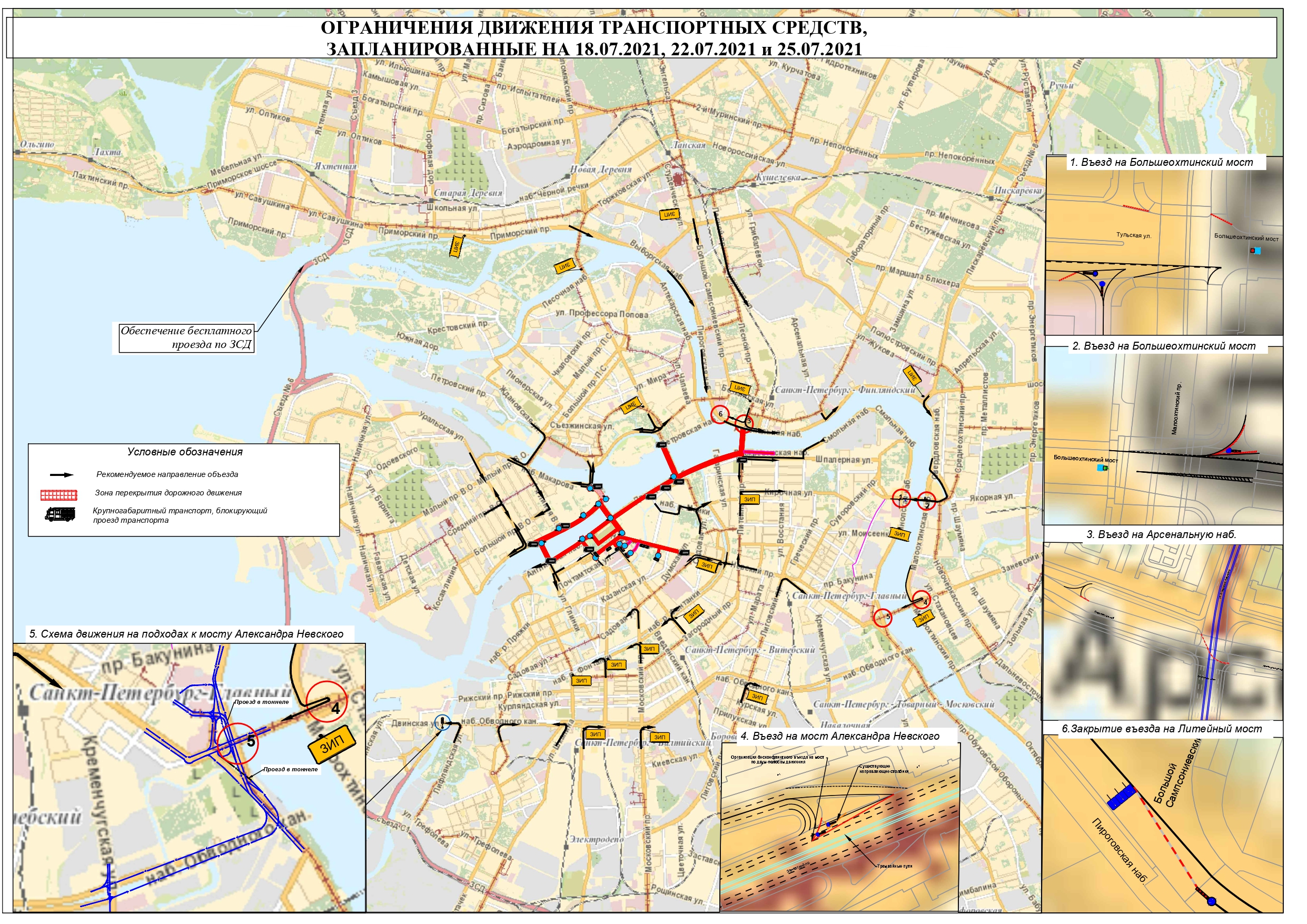 В это же время автомобили не смогут проехать по Адмиралтейской набережной, Дворцовой набережной, Сенатской площади от Английской набережной до Конногвардейского бульвара, Дворцовому проезду, Невскому проспекту от Малой Морской к Адмиралтейскому проспекту, Университетской набережной, Мраморному переулку, набережной Кутузова, набережной Лейтенанта Шмидта от 8–9-й линий Васильевского острова до Благовещенского моста. Полный список можно посмотреть здесь