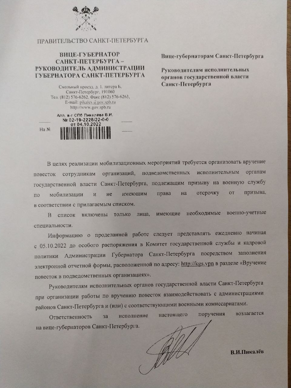 Правительство Петербурга поручило вице-губернаторам города и руководителям бюджетных компаний организовать мобилизацию в подведомственных учреждениях. Об этом свидетельствует официальное поручение, копию которого «Бумаге» предоставил сотрудник бюджетной организации.