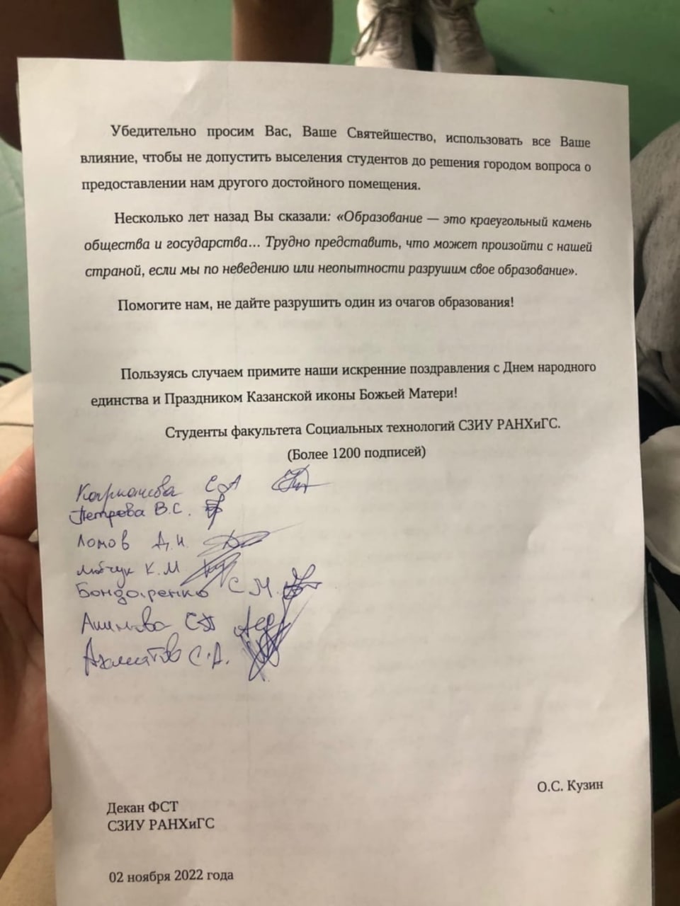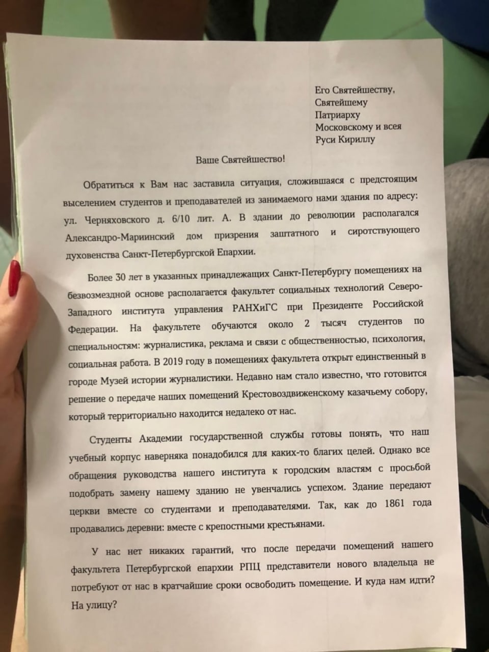 Студенты факультета Социальных технологий собирают подписи под обращением к патриарху Кириллу (обращение есть в распоряжении «Бумаги»), однако гарантий, что это поможет закончить семестр в здании на Черняховского, нет.