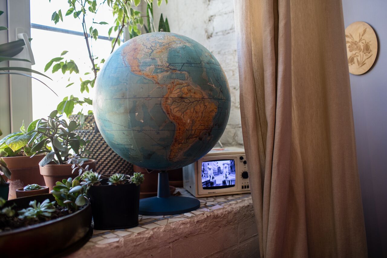 Помимо общей зоны, где по вечерам устраивают кинопоказы и играют в настольные игры, есть компьютерный зал с тремя «Макбуками». Там же висит географическая карта, где гости могут отметить свою страну. На столиках — цветы и старая печатная машинка, стены увешаны фотографиями, рамками от картин, тарелочками.