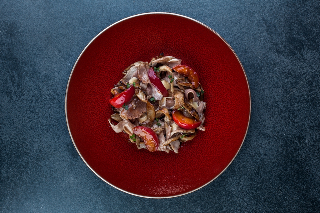 Свиная грудинка слегка обжаривается на сковороде, а затем несколько часов томится в духовке при невысокой температуре. После приготовления мясо смешивается с жареными вешенками, маринованной сливой и заправляется лимонным курдом.