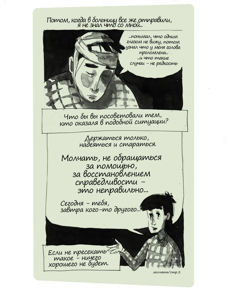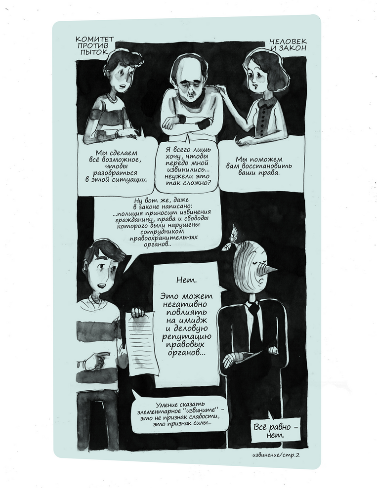 Проект «Новый активизм» — мой второй опыт создания историй на социально значимые темы. Первым был проект «Respect», для которого я сделала комикс «Шубы», посвященный проблеме африканских беженцев. В историях для выставки «Новый активизм» я постаралась осветить социальную проблему нарушения прав человека органами власти и работу НКО по решению таких дел.