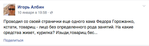 Прокомментировал запись и создатель сайта zalivaet.spb Федор Горожанко, написавший, что «Игорь Николаевич реально ******* [ненормальный]» . После этого Албин удалил его из друзей со словами «Изыди, товарищ бес».