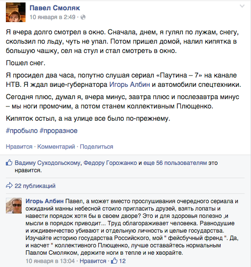 Редактор журнала «Шум» Павел Смоляк опубликовал пост, в котором пожаловался на не убранный во дворе снег, не приехавшую спецтехнику и упомянул нового вице-губернатора Игоря Албина. В ответ чиновник написал, что «вместо прослушивания очередного сериала и ожиданий манны небесной стоило пригласить друзей, взять лопаты и навести порядок хотя бы в своем дворе». «Труд облагораживает человека. Равнодушие и иждивенчество убивают и отдельную личность и целые государства», — констатировал Албин.