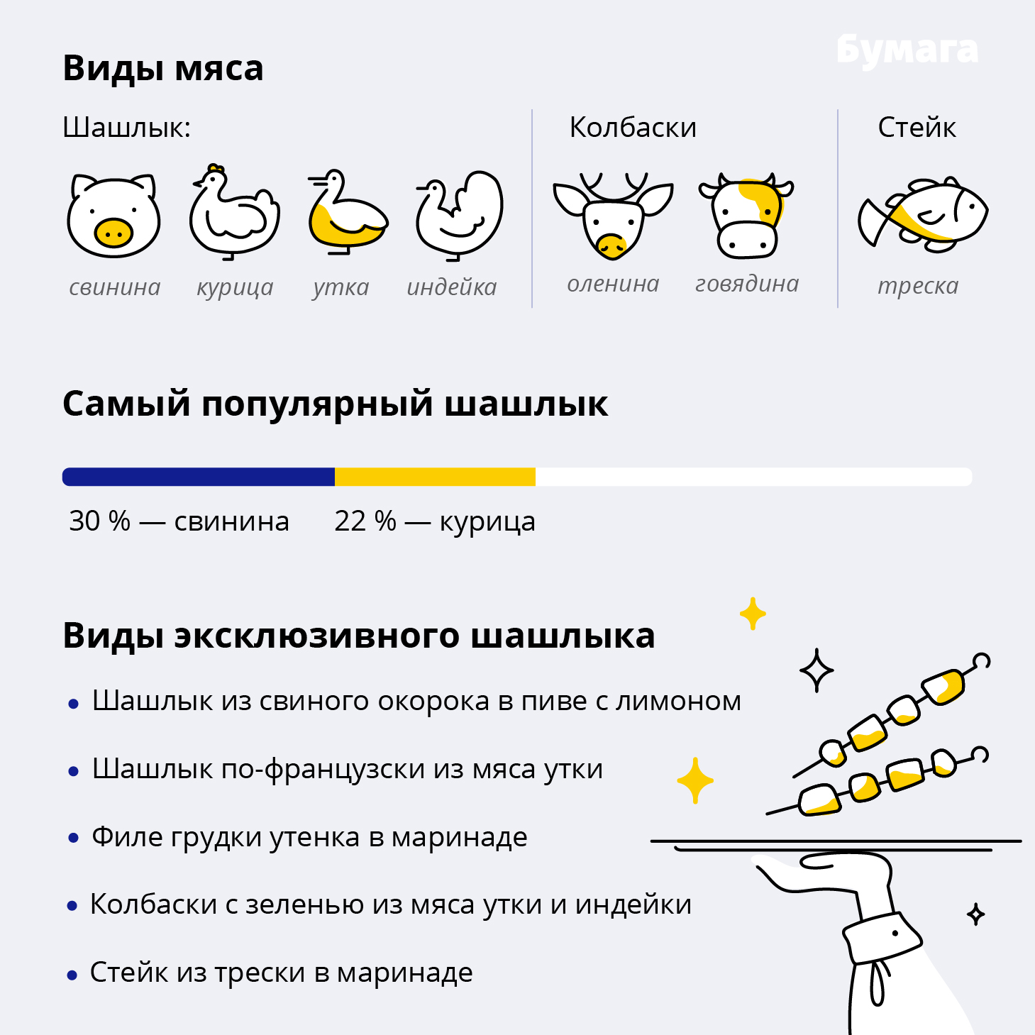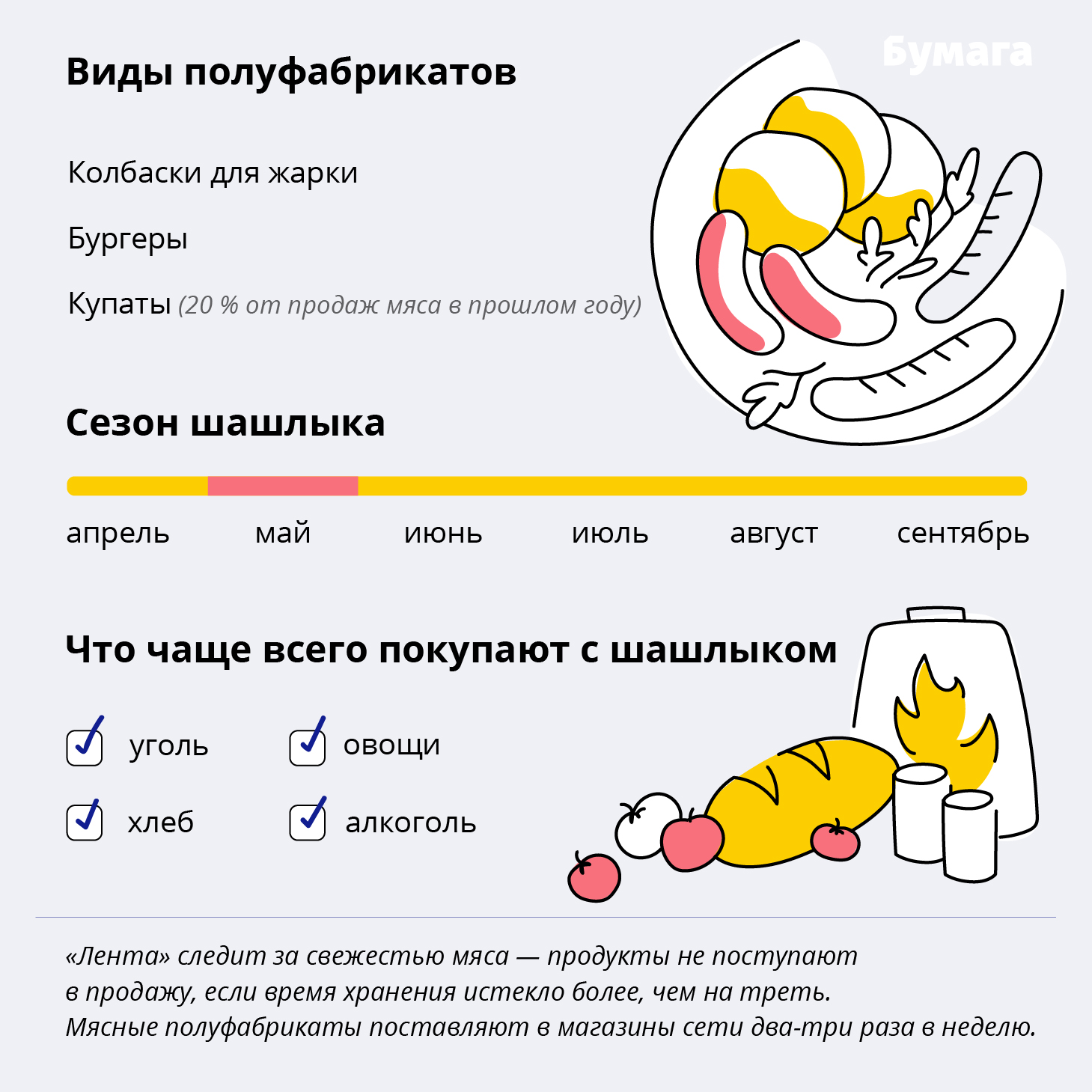 В Петербурге до сентября продлится гриль-сезон — время, когда горожане активно выбираются на природу, чтобы пожарить шашлык и отдохнуть. Из какого мяса чаще всего покупают шашлыки и какие товары берут вместе с ними, смотрите в инфографике «Бумаги», подготовленной вместе с сетью магазинов «Лента».