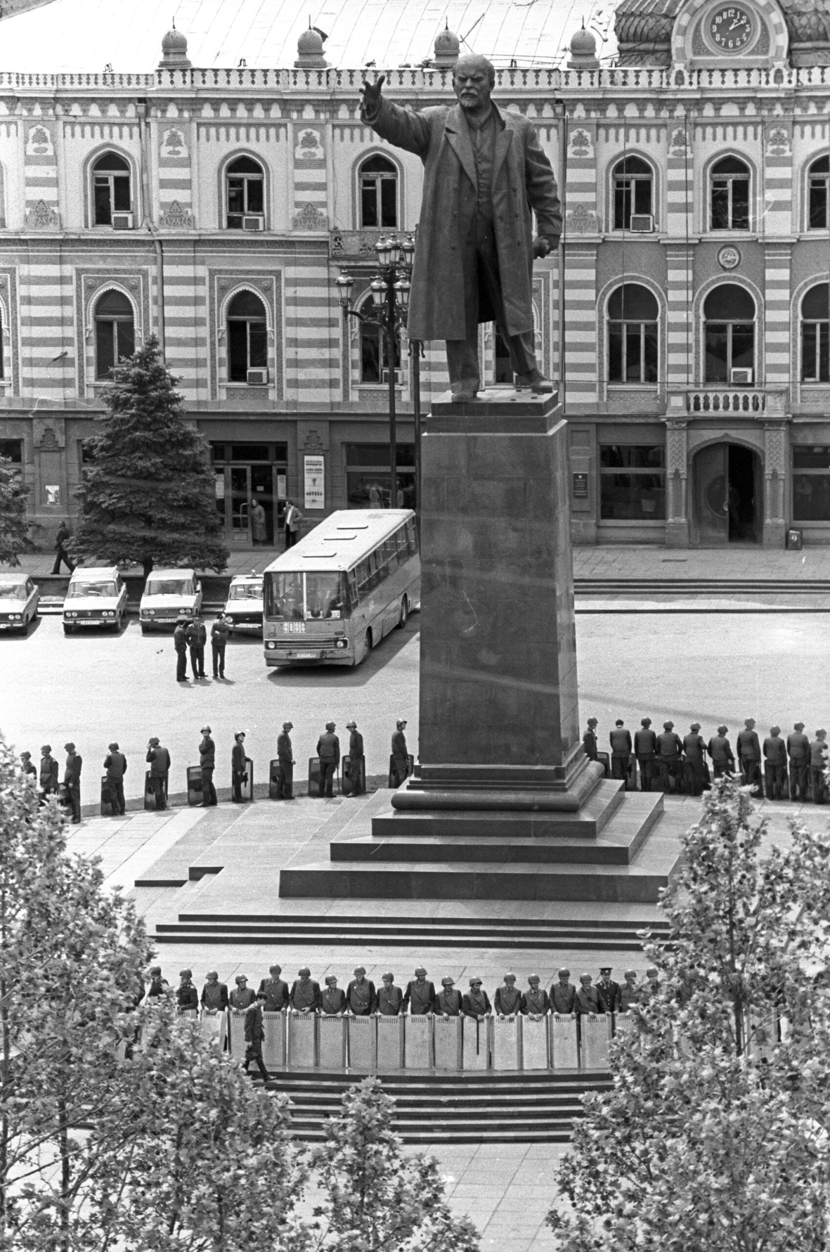 Или вот — памятник Ленину в начале 1990-х на площади Свободы, в советское время носившей имя вождя. Интересную деталь я заметил на первой фотографии. Она снята 22 апреля 1990 года — в день рождения Ленина. Судя по всему отряд омона с железными щитами охраняет памятник вождю в такую дату.