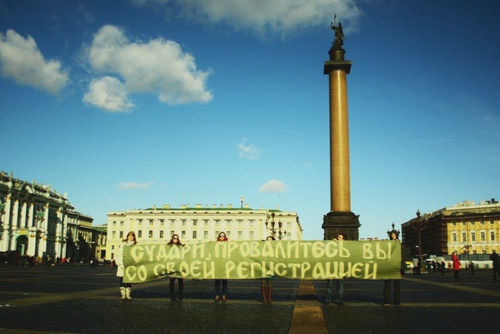 Активисты движения «Весна» вышли на Дворцовую площадь с транспарантом «Судари, провалитесь вы со своей регистрацией», чтобы по-петербургски поддержать акцию москвичей, вышедших к Кремлю с матерным баннером против «закона о прописке».