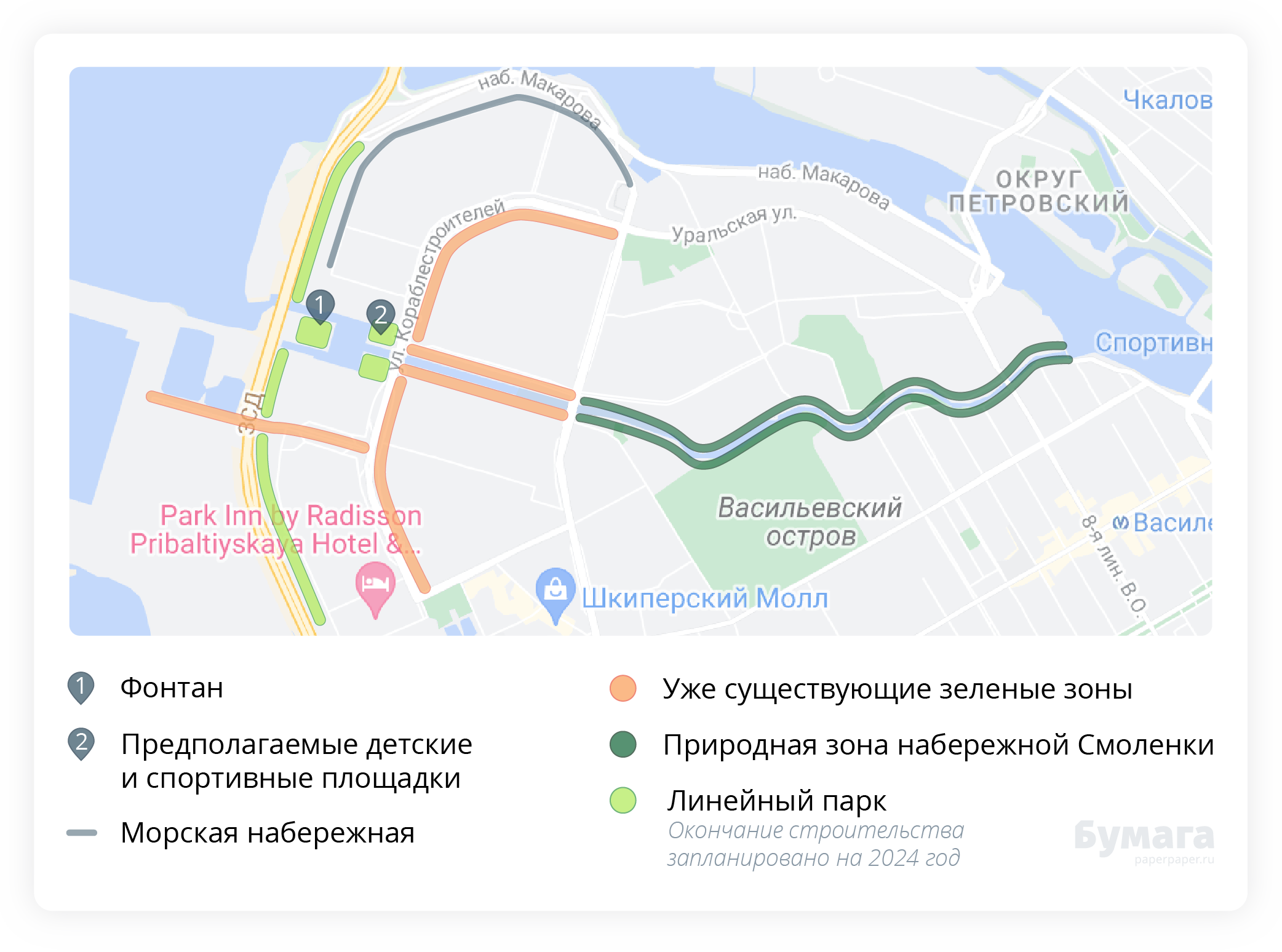 Будущий парк соседствует с зеленой частью берегов Смоленки, которую экоактивисты называют «нетронутым уголком природы» — они предлагают присвоить этим местам статус особо охраняемой территории. «Бумага» показывает на карте, где расположится Линейный парк и как его участки соотносятся с природной частью, которую активисты надеются защитить от благоустройства.