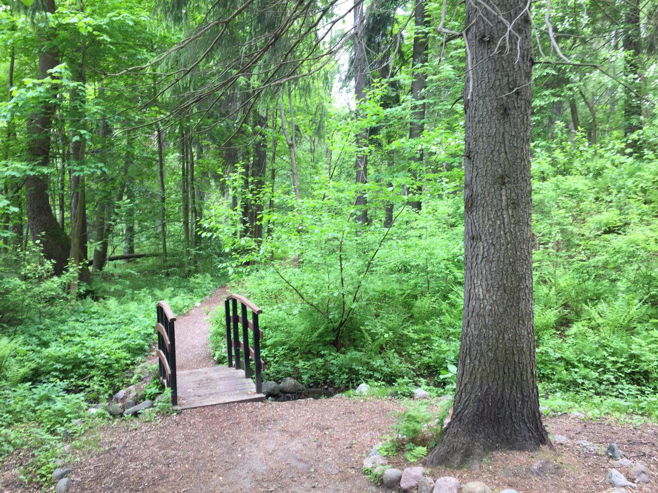 Экотропа местами выстлана деревянными панелями, через ручьи переброшены живописные мостики. Вдоль тропы, что важно, установлены урны и информационные стенды с рассказами о флоре и фауне района (например, о гигантских муравейниках). Завершается она выходом к Финскому заливу.