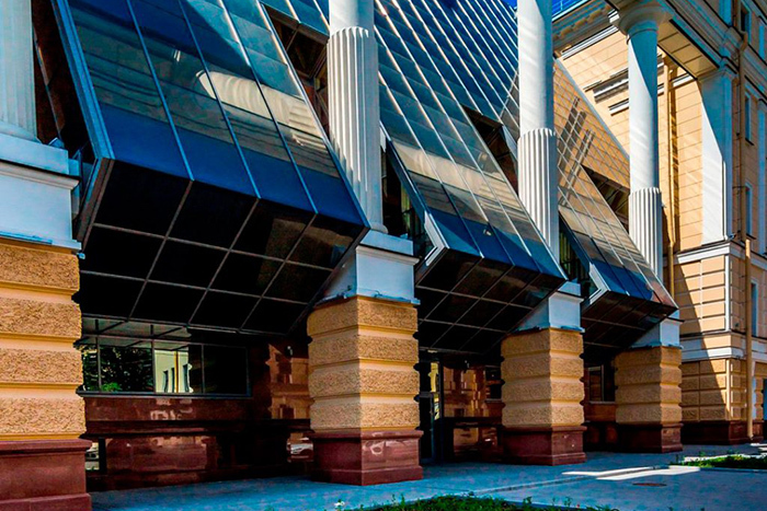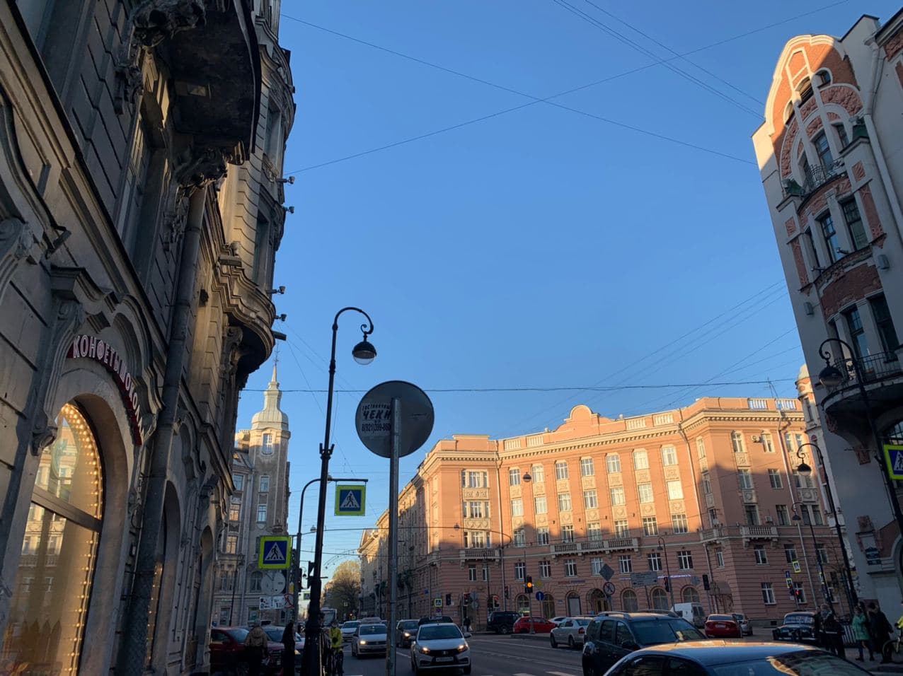 Гостиница Park Inn Nevsky. Ее построили в конце нулевых по проекту Святослава Гайковича. Фасады, выходящие на Невский проспект и Гончарную улицу, оформлены портиками, в которых роль колонн выполняют стеклянные эркеры гостиничных номеров.