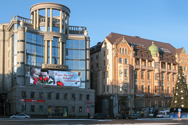 Торгово-офисный центр Regent Hall. Это один из ключевых архитектурных символов постсоветского Петербурга. Из-за обилия стекла и броских декоративных решений его причисляют к главным архитектурным ошибкам в истории города, был даже проект его реконструкции.